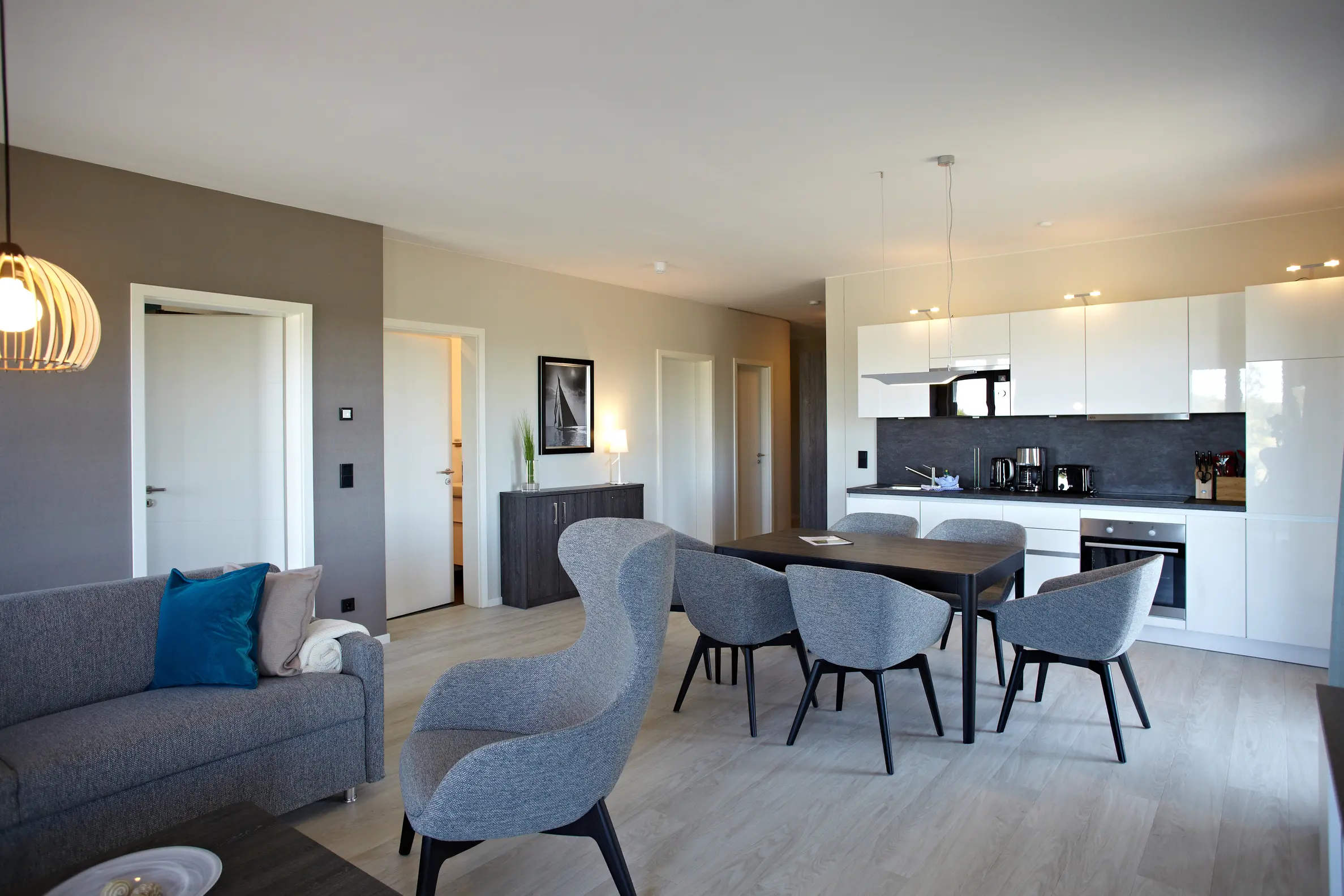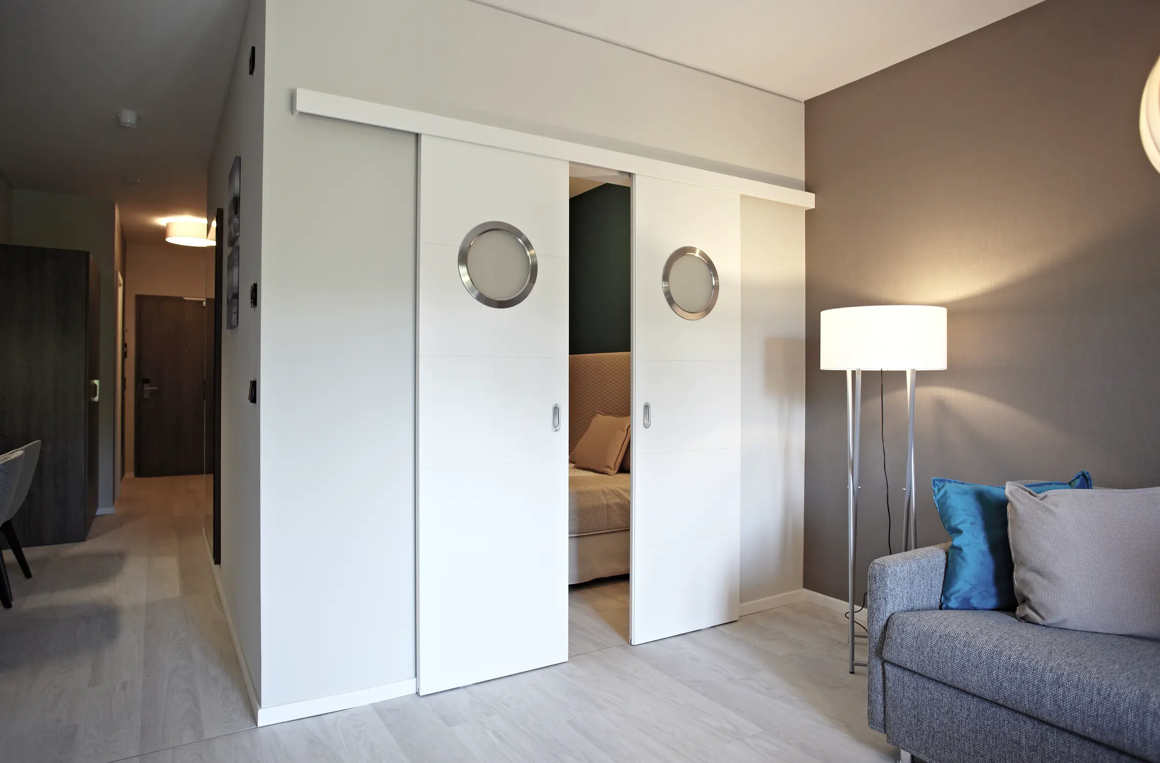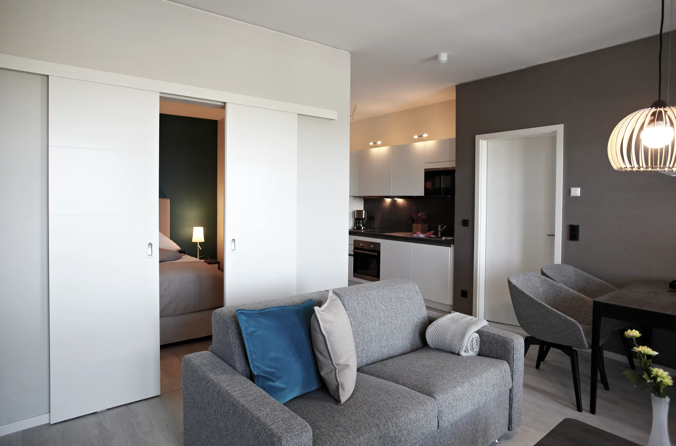 Prostorné apartmány od 40 m2 do 180 m2 v bytovém komplexu ZWEI WASSER vás zvou k pobytu. Nabízejí dostatek prostoru k relaxaci a navození dobrého pocitu. Zvláštností pojetí celého konceptu interiéru jsou dvoukřídlé posuvné dveře PRÜM Royal 251 v Bílé exclusiv s atypickými skleněnými výplněmi v horní části dveřního křídla připomínající "okna do ponorky". Jelikož se jedná o přestavbu školy pro námořníky na bytové jednotky, pak se takovéto atypicky řešené prosklení, vzhledem k původnímu zaměření objektu, nabízelo.