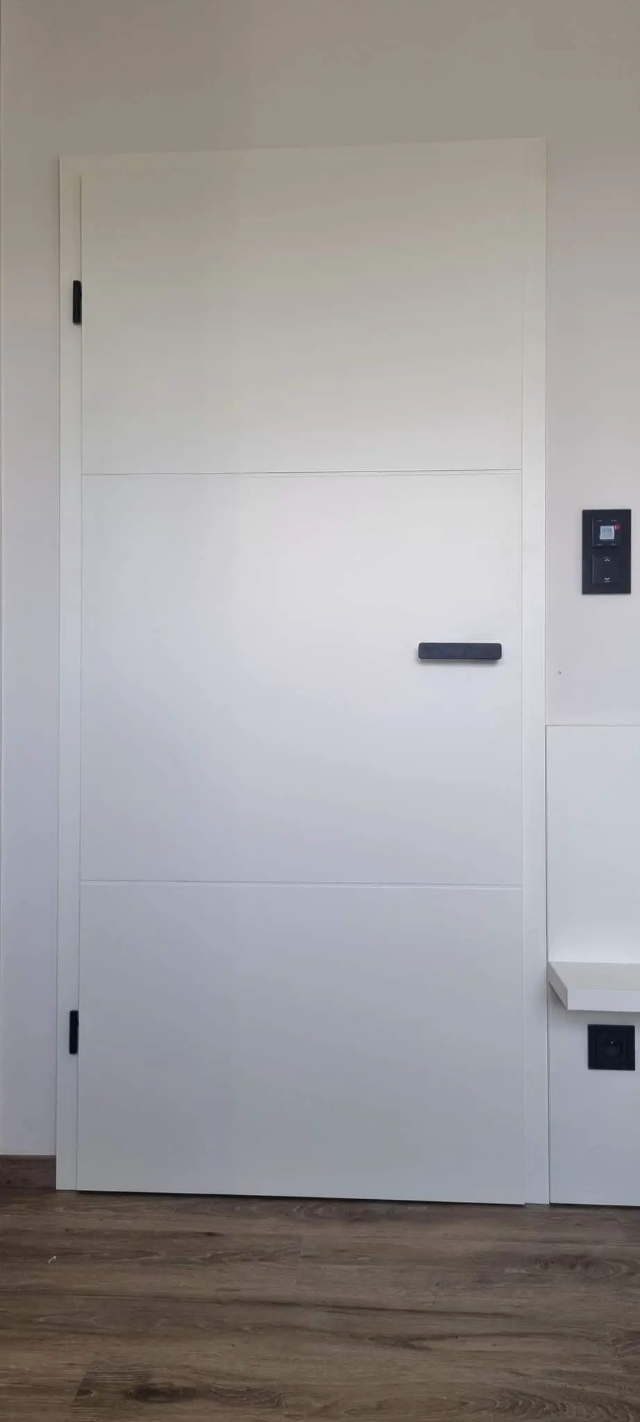 Představujeme vám interiér, který spojuje čistotu, jednoduchost a eleganci v dokonalém souladu. Bíle lakované dveře PRÜM Royal 231 vytvářejí harmonické propojení mezi jednotlivými místnostmi, zatímco skleněné dveře s čirým sklem Float přinášejí do prostoru vzdušnost a přirozené světlo. Každý detail byl pečlivě promyšlen – od černých klik až po subtilní černé panty, které podtrhují moderní design a dodávají interiéru jemný kontrast.