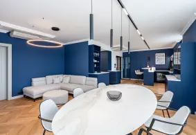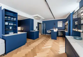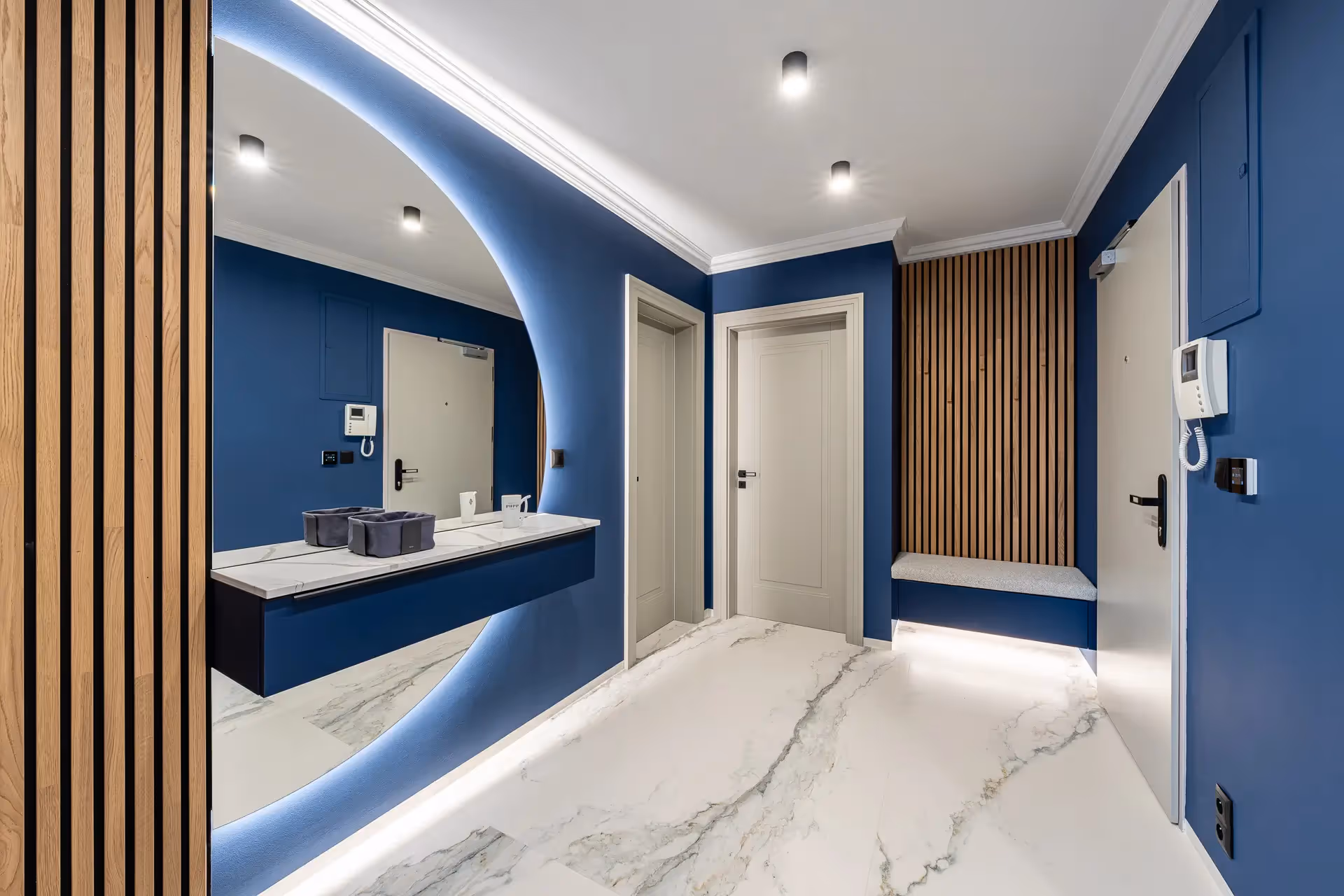 Celý interiér je laděn do kombinace dubu, bílé a námořnické modré, která působí vzdušně, klidně a přitom velmi luxusně.