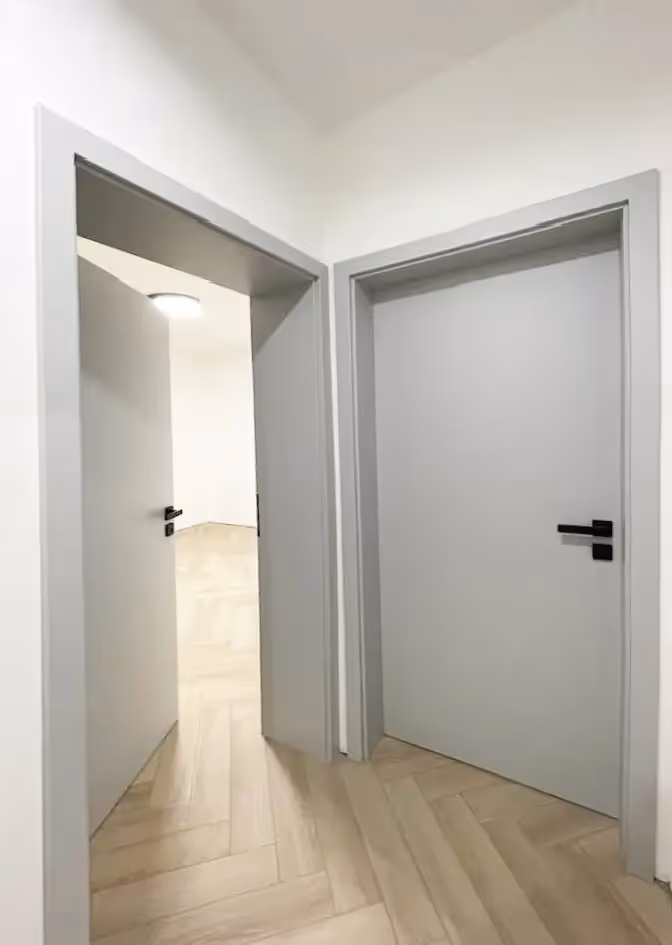 Stylová realizace se světle šedými dveřmi PRÜM Standard
