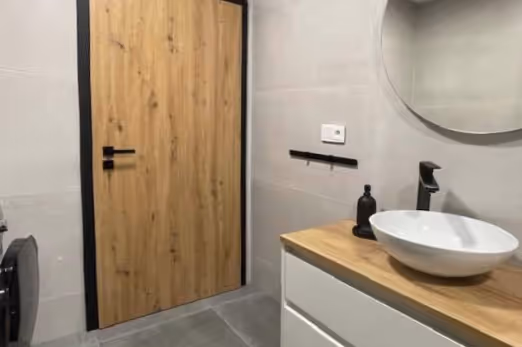 Dvere v prekrásnom drevodekore v čiernej zárubni a s čiernymi doplnkami