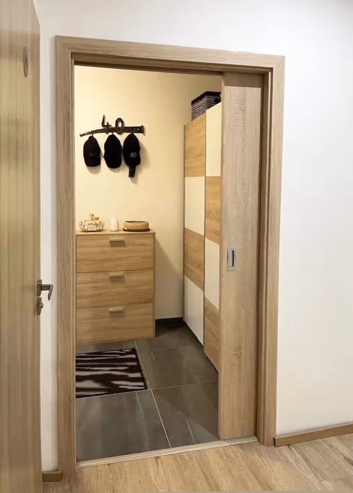 Krásna realizácia interiérových dverí PRÜM Standard v povrchu CPL Touch dub DA...aj v posuvnej verzii do puzdra. Nechajte sa inšpirovať krásne zariadeným interiérom. Všetko vkusne zladené. Vďaka širokej ponuke nábytku, obkladov a bytových doplnkov použiteľných s týmto povrchom dverí, je isté, že voľba tohto povrchu do vášho interiéru je krok správnym smerom.