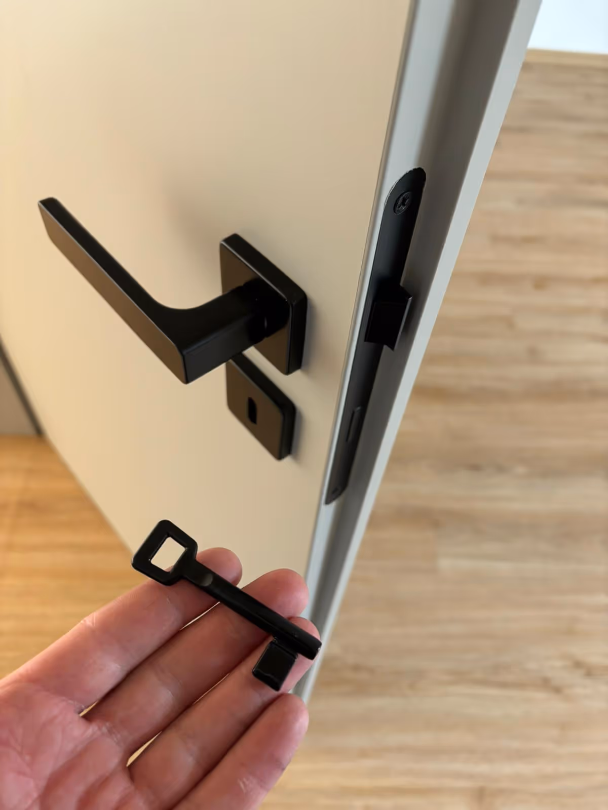 Ochutnajte našu realizáciu interiérových dverí PRÜM v nádhernej Hodvábne šedej farbe, ktorá dokonale ladí s rôznymi dizajnovými štýlmi. Tieto dvere sú ideálnou voľbou pre moderné interiéry, kde je dôležitá harmónia designu a praktickosť. Dvere sú doplnené čiernou kľukou a čiernymi pántami, čo podčiarkuje ich moderný vzhľad.