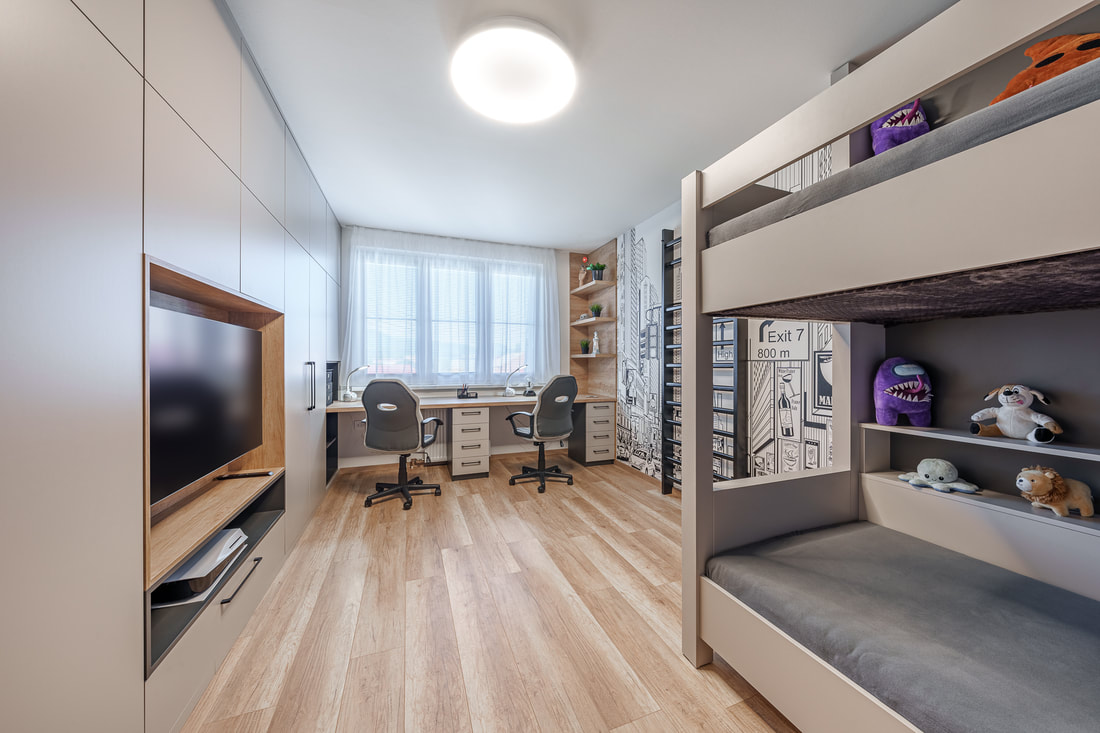 "Byt ve střešní nástavbě panelového domu si koupila mladá maminka s dvěma školáky a požádala nás o návrh nového vybavení bytu. Netušila, že je možná nějaká změna dispozice, takže když jsme přišli s návrhem, že mimo jiné může mít i koupelnu s velkou vanou, velkým sprchovým koutem a s oknem, byla mile překvapená. Zajímavých změn bylo nakonec poměrně hodně a rozdíl mezi stavem, ve kterém byt koupila je opravdu veliký. "