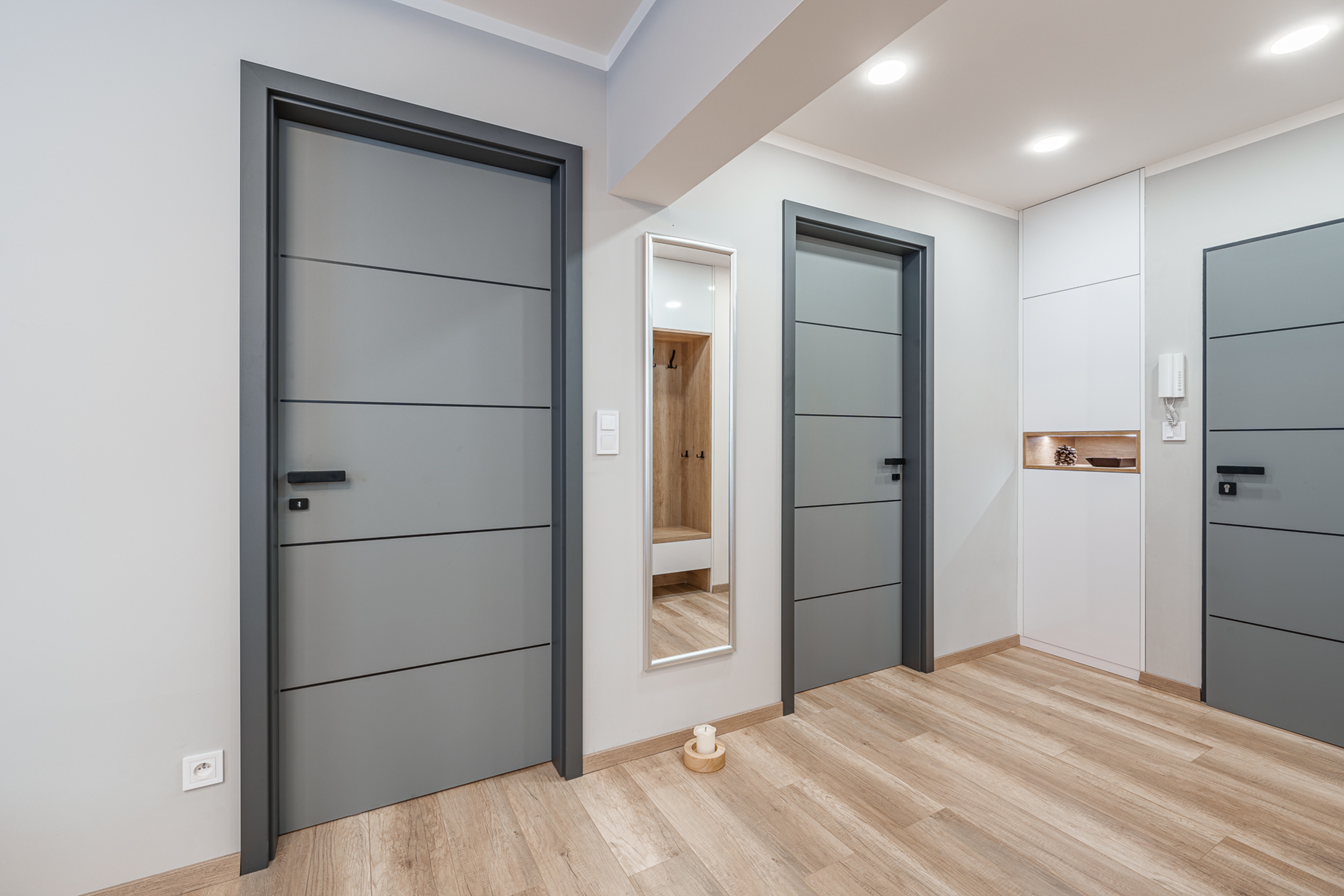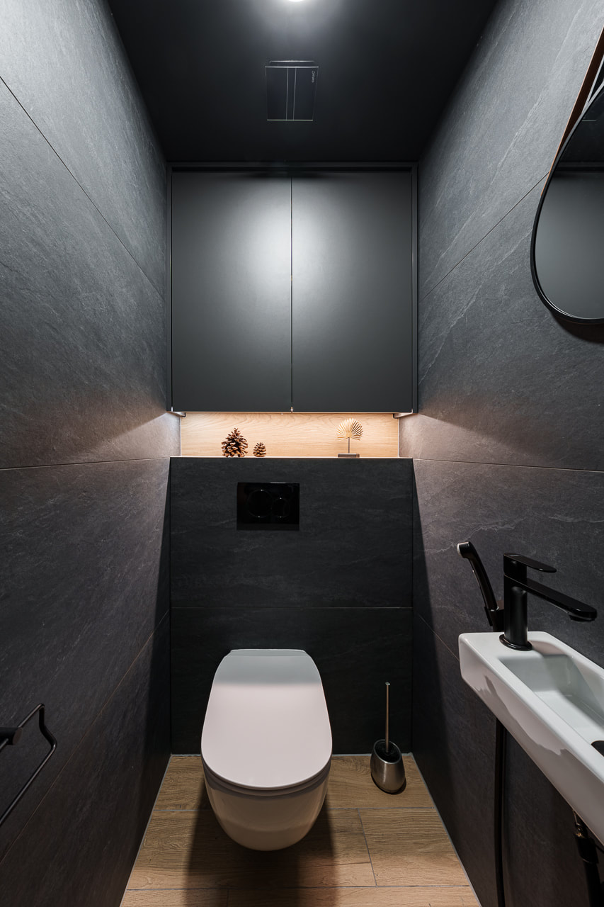 Celý interiér doladily interiérové dveře PRÜM Royal 151-Black s černými proužky na dveřních křídlech v povrchu CPL Prachová šedá a zárubně s Mini hranou KR v povrchu CPL Grafitová šedá. V tomto případě byly použity dveře výšky 2110 mm. Dveře doplněny o černé kování Minimal v povrchu TiN-K od firmy M&T kliky.