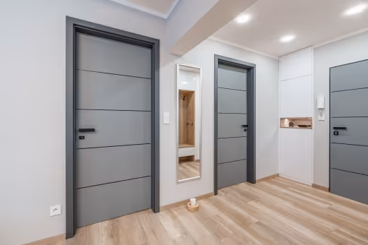 Celý interiér doladili interiérové dvere PRÜM Royal 151-Black s čiernymi prúžkami na dverných krídlach v povrchu CPL Prachová šedá a zárubne s Mini hranou KR v povrchu CPL Grafitová šedá. V tomto prípade boli použité dvere výšky 2110 mm. Dvere doplnené o čierne kovanie Minimal v povrchu TiN-K od firmy M&T kľučky.